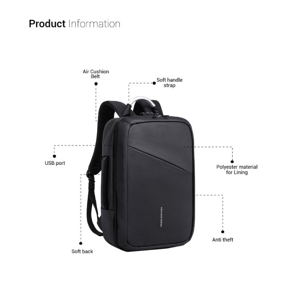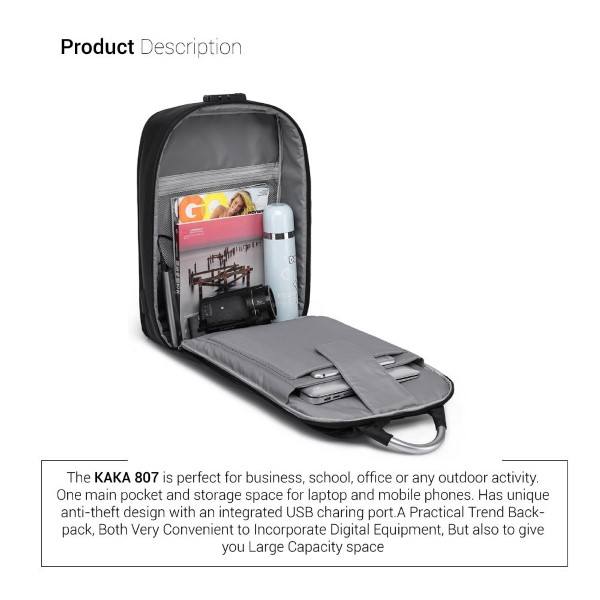 The Kaka 807 is perfect for business, school, office and any outdoor activity. Our main pocket and storage space for laptop and mobile phones. has unique anti theft design with integrated USB charging port. A practical trend back pack, both very convenient to incorporate digital equipment but also give you large capacity space.