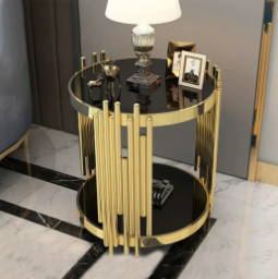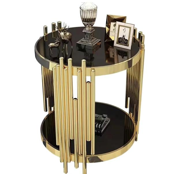 This stylish, round side table showcases a tempered glass top paired with an electroplated gold frame for a contemporary touch. The unique design features vertical metal accents, adding a luxurious flair. Ideal for enhancing modern interiors and displaying your favorite decor items.