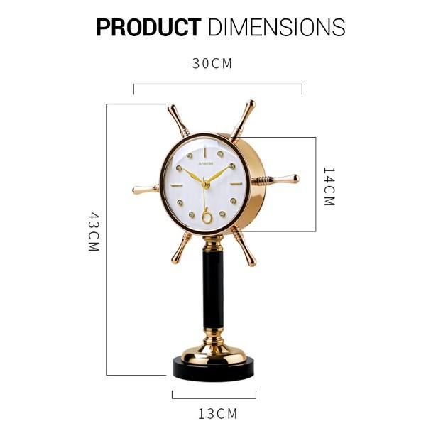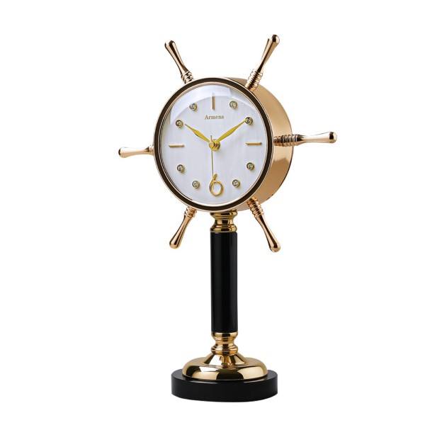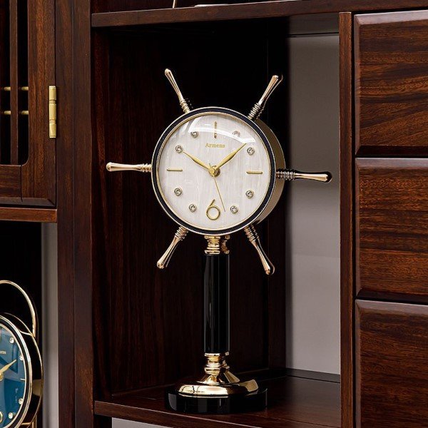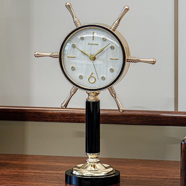 This Armens Table Clock (Model 6962B-1) is a variation of the nautical-themed clock, specifically designed in the shape of a Ship Wheel. This model provides a classic, crisp aesthetic: