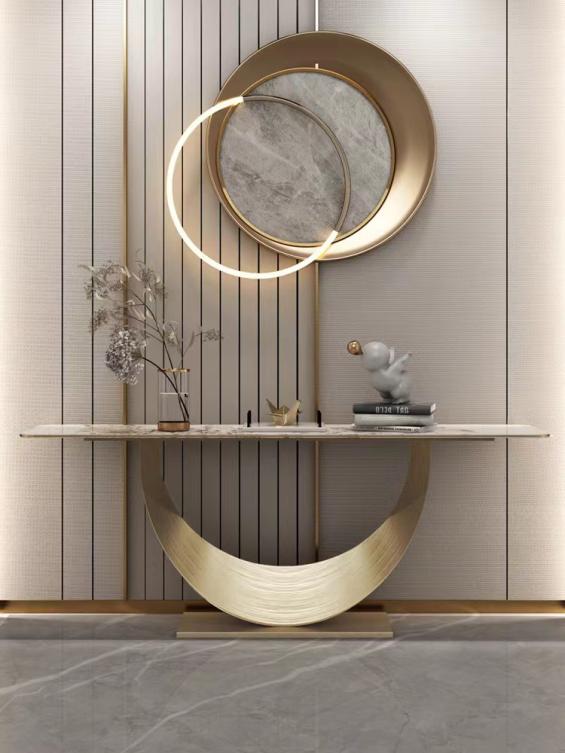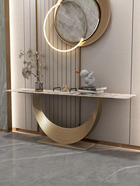 The Moon Console Table is made of a sintered stone top and a shiny gold stainless steel base. Its grandeur crescent-shaped base features a smooth curve with a gold finish, which adds firm support to the tabletop. Its sintered stone top provides a graceful appearance while giving it a durable and easy-to-maintain surface. Place this beautiful and narrow hallway table in any corner to redefine its beauty.