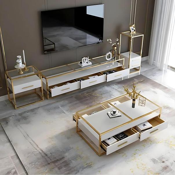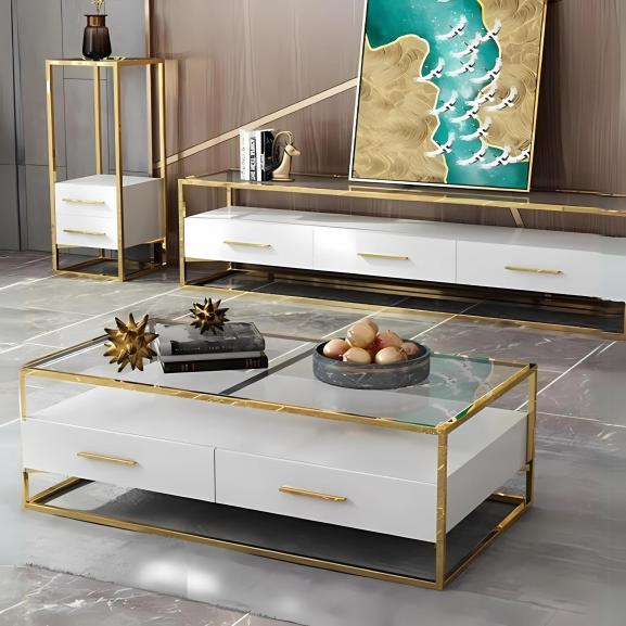 This coffee table features a chic glass top with a sturdy metal frame, accented with golden finishes.