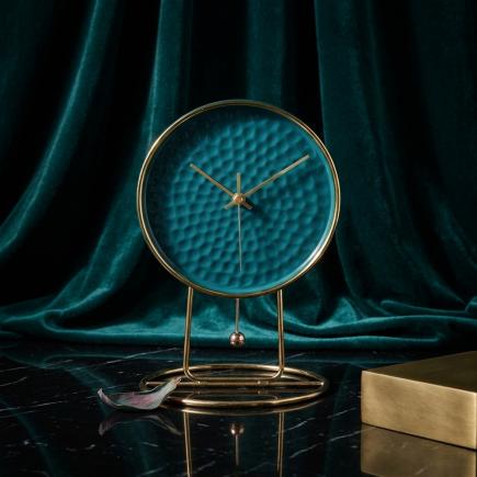 This decorative clock is a Luxury Silent Table Clock (Model 6932A-1) with a distinctive Golf Ball design element. It features a striking Turquoise & Gold Finish, giving it a rich and vibrant appearance. As a Silent clock, it is designed to operate without the disruptive ticking noise, making it suitable for any quiet space like a bedroom, office, or living room, and its luxurious finish makes it a great gift or executive accent piece.