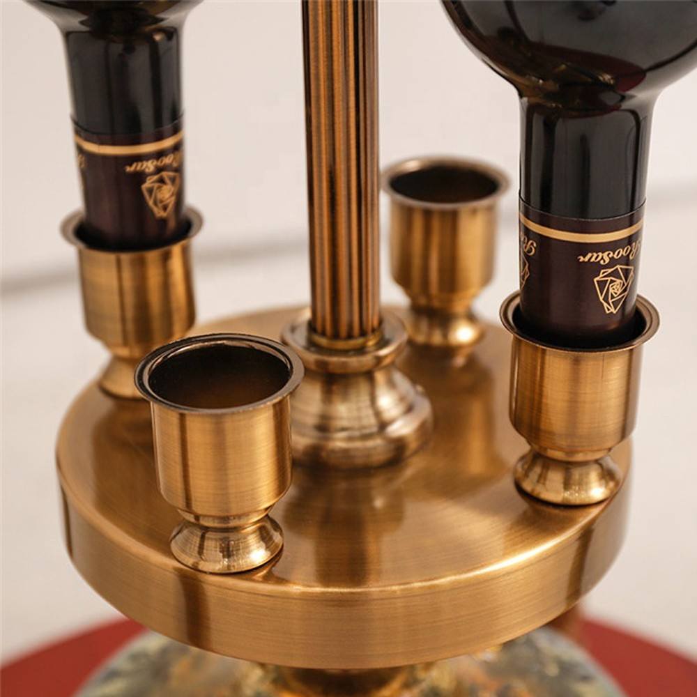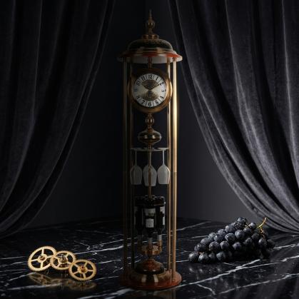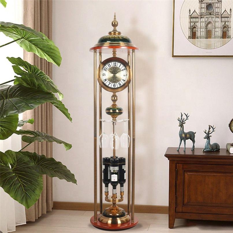 This is a high-end, multifunctional piece described as a Luxury Standing Bronze Clock (Model 60002). It is a decorative floor or tall table clock that also serves as a sophisticated Wine Bottle and Glass Holder. The "Bronze" finish suggests a rich, metallic, and opulent appearance, making it a prominent and functional statement piece for a dining area, bar, or living room.
