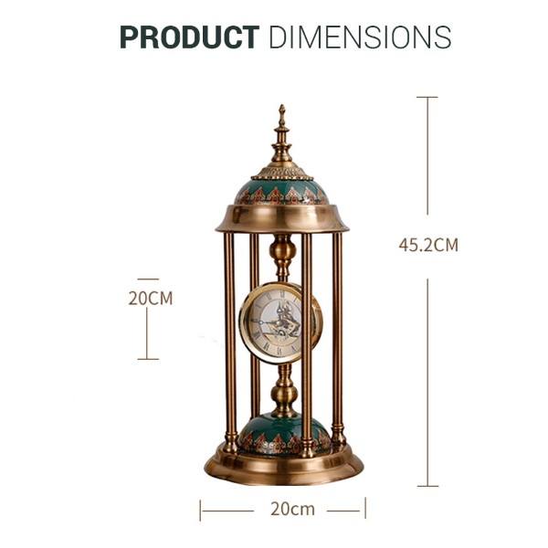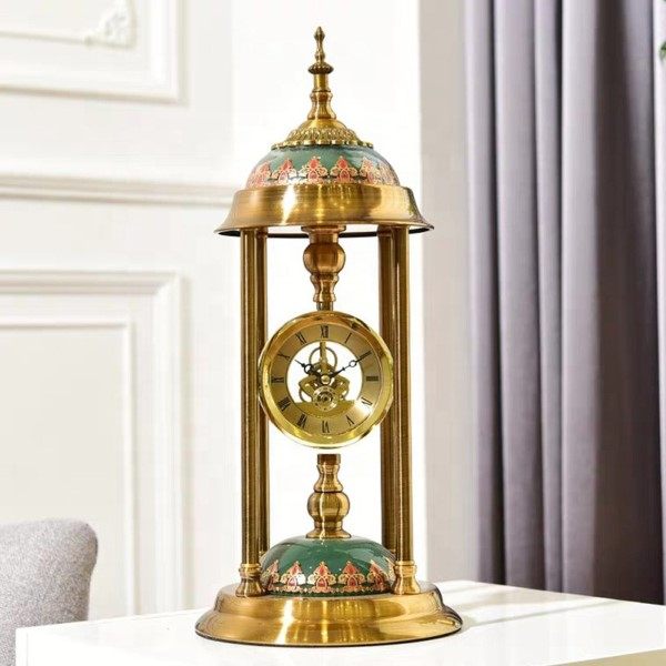 This is a Luxury Table Clock (Model 6818-1) featuring a distinctive Temple Style design. The clock is noteworthy for its unique finish, which includes a Green Hand Painted Base and Top, giving it an ornate, detailed, and artistic look. Crucially, it is a Silent clock, meaning it operates without the common ticking sound, making it perfect for bedrooms, offices, or quiet living spaces. The combination of its luxury finish and quiet operation makes it a high-end decorative accent.