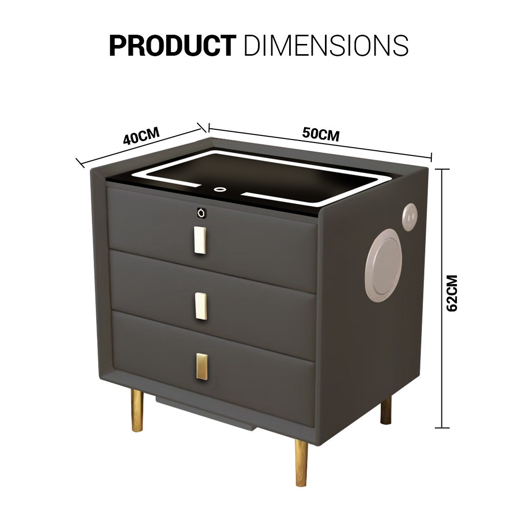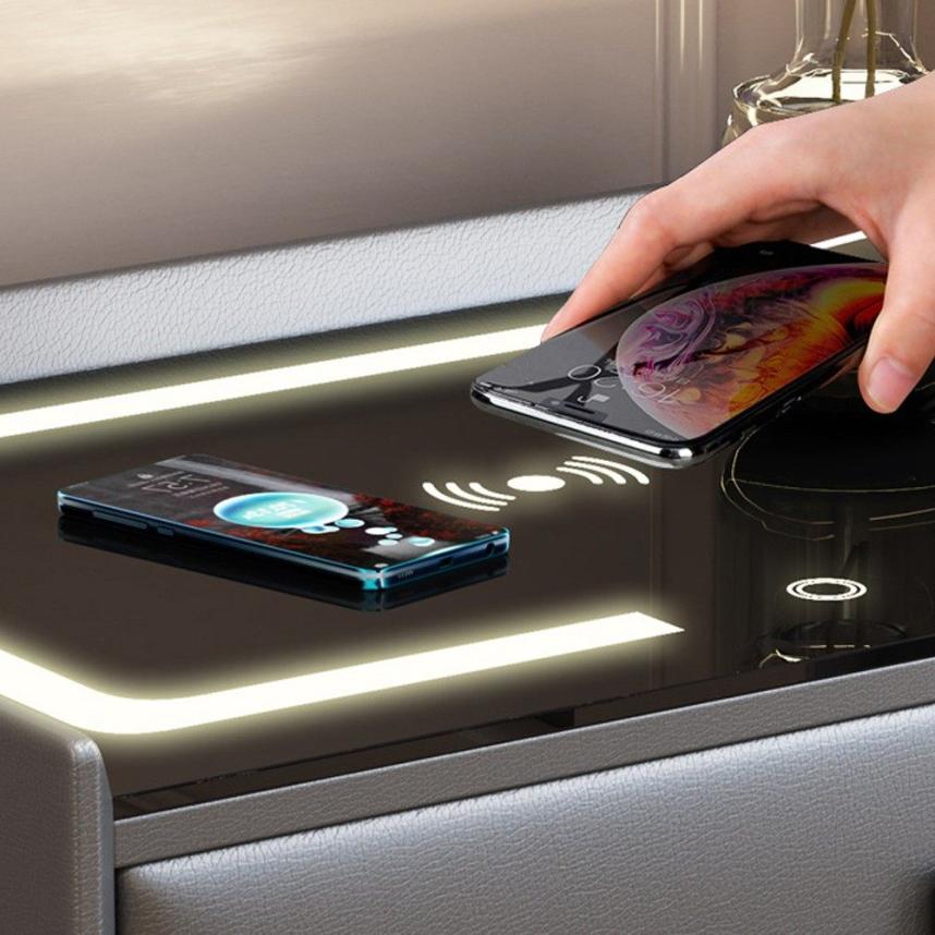 The Modern Intelligent Bedside Table (Model K29-2) is a multi-functional nightstand that combines storage with modern technology. This cabinet, featured here in Gray, includes integrated features for a highly convenient bedside experience.