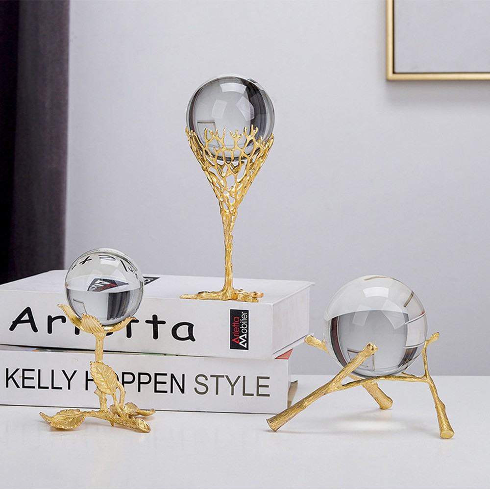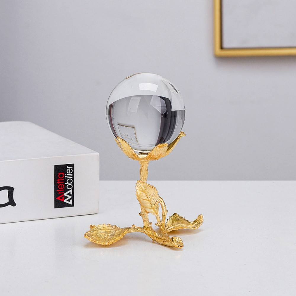 This charming piece of decorative art features a brilliant Crystal Ball perched on an elegant, stylized Gold Leaf Pedestal (Model BJ292). The base is designed with subtle, organic leaf detailing, adding a touch of natural beauty and romance to the modern, minimalist crystal sphere. This striking combination of clear crystal and detailed gold-toned metal makes it a perfect accessory for adding a luxurious and harmonious accent to any space.