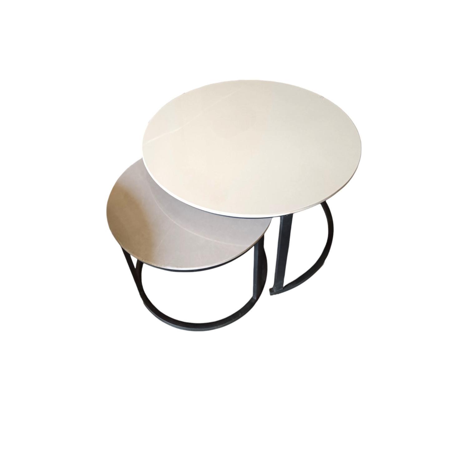The set includes two round tables of different sizes, designed to nest together seamlessly for both functionality and style. With a sleek black tabletop and sturdy metal frames, these tables are the perfect addition to any modern or contemporary décor.